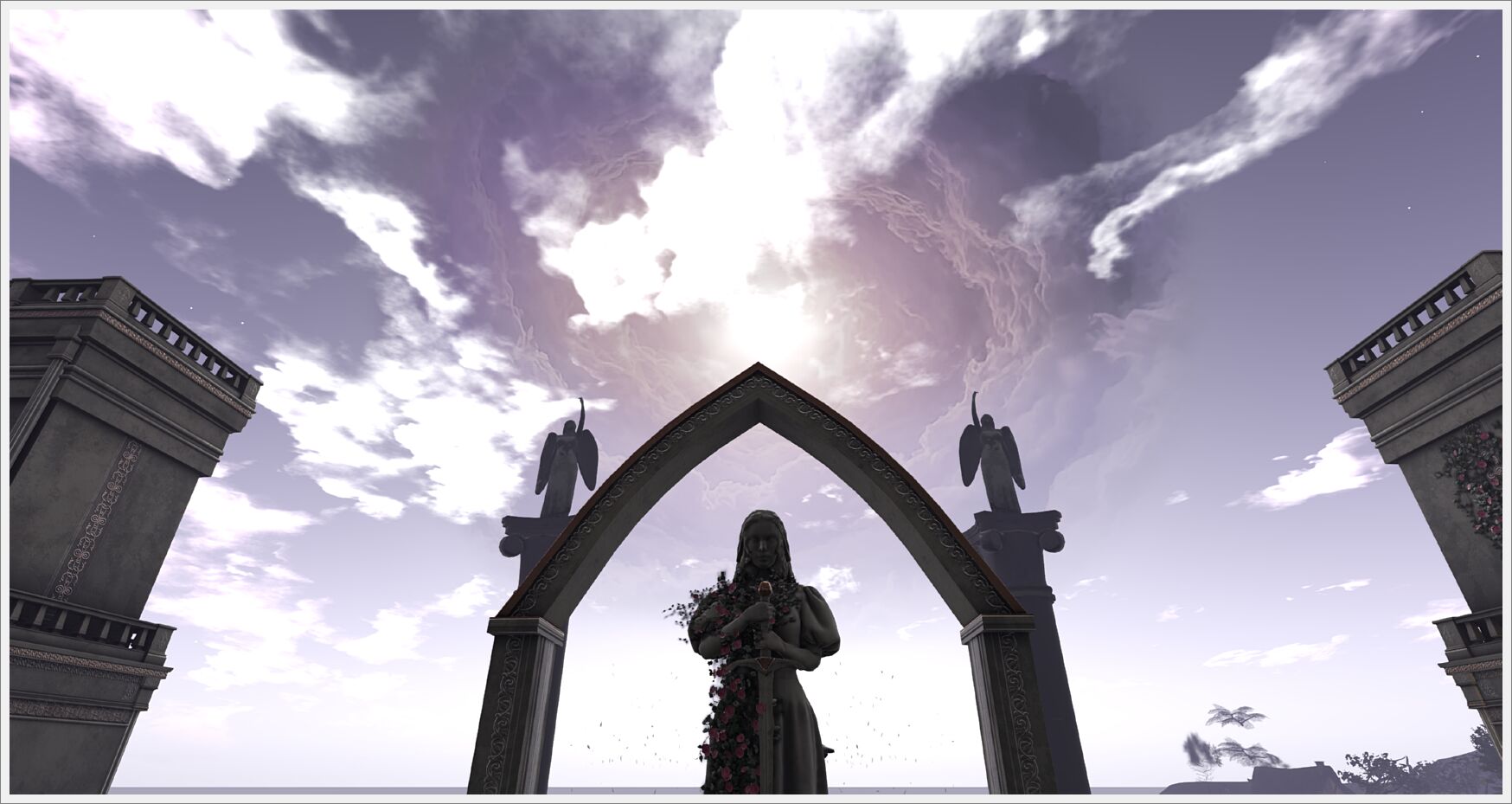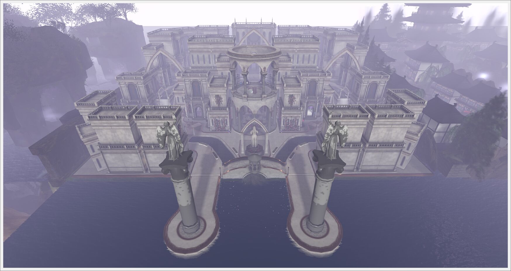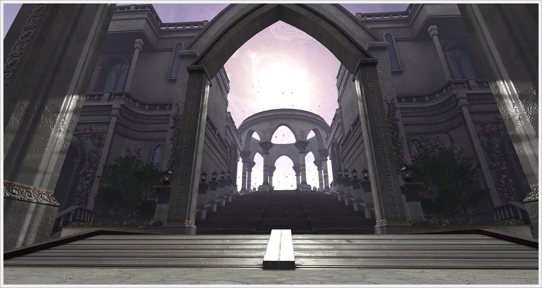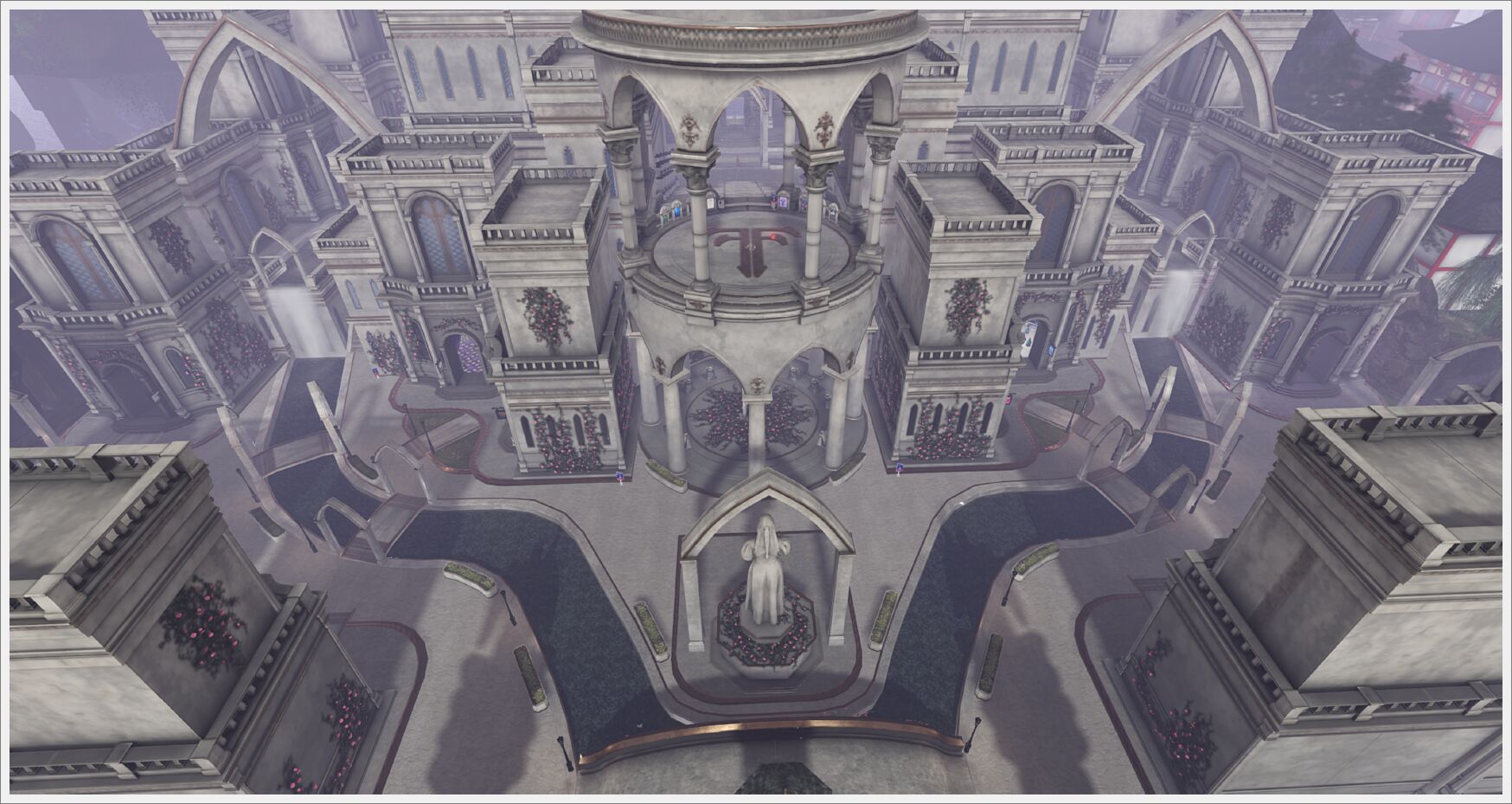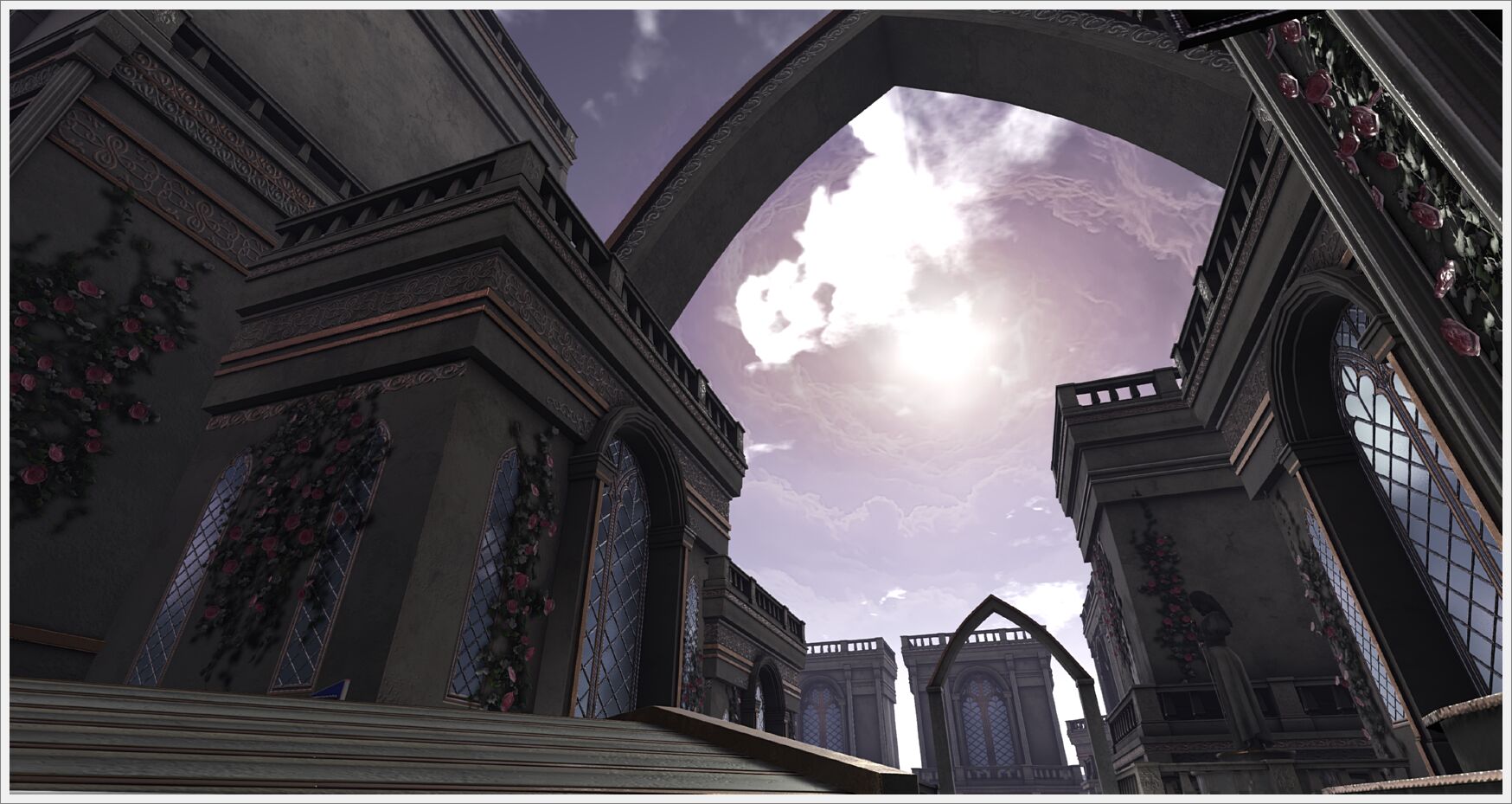 Roses creep up white walls among carved stone pillars, while a stream meanders through them. Stained glass glimmers in the sky while petals fall down blisfully. A times you can catch a glimpse of one of the Gleamfolk as they do their job.