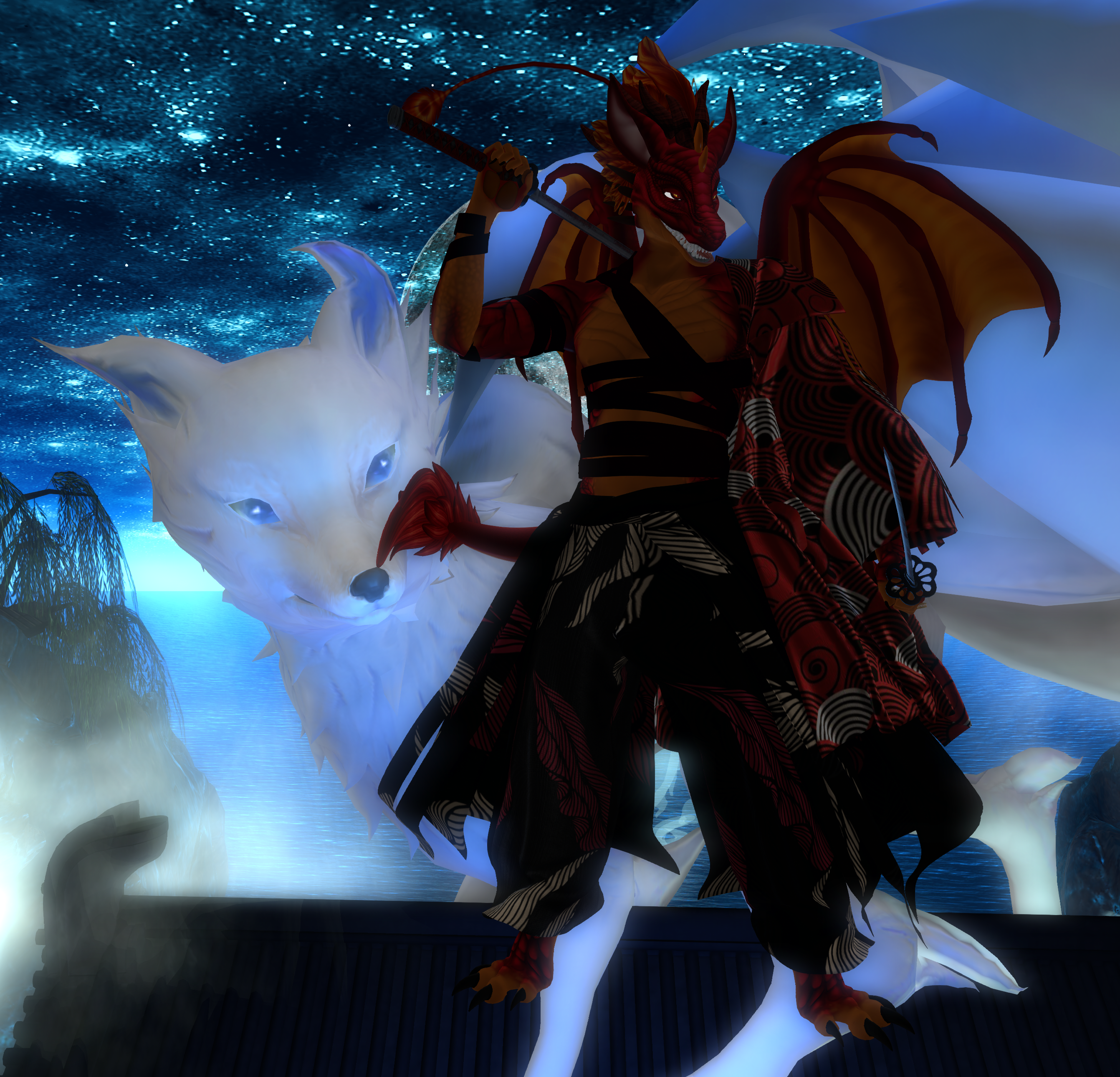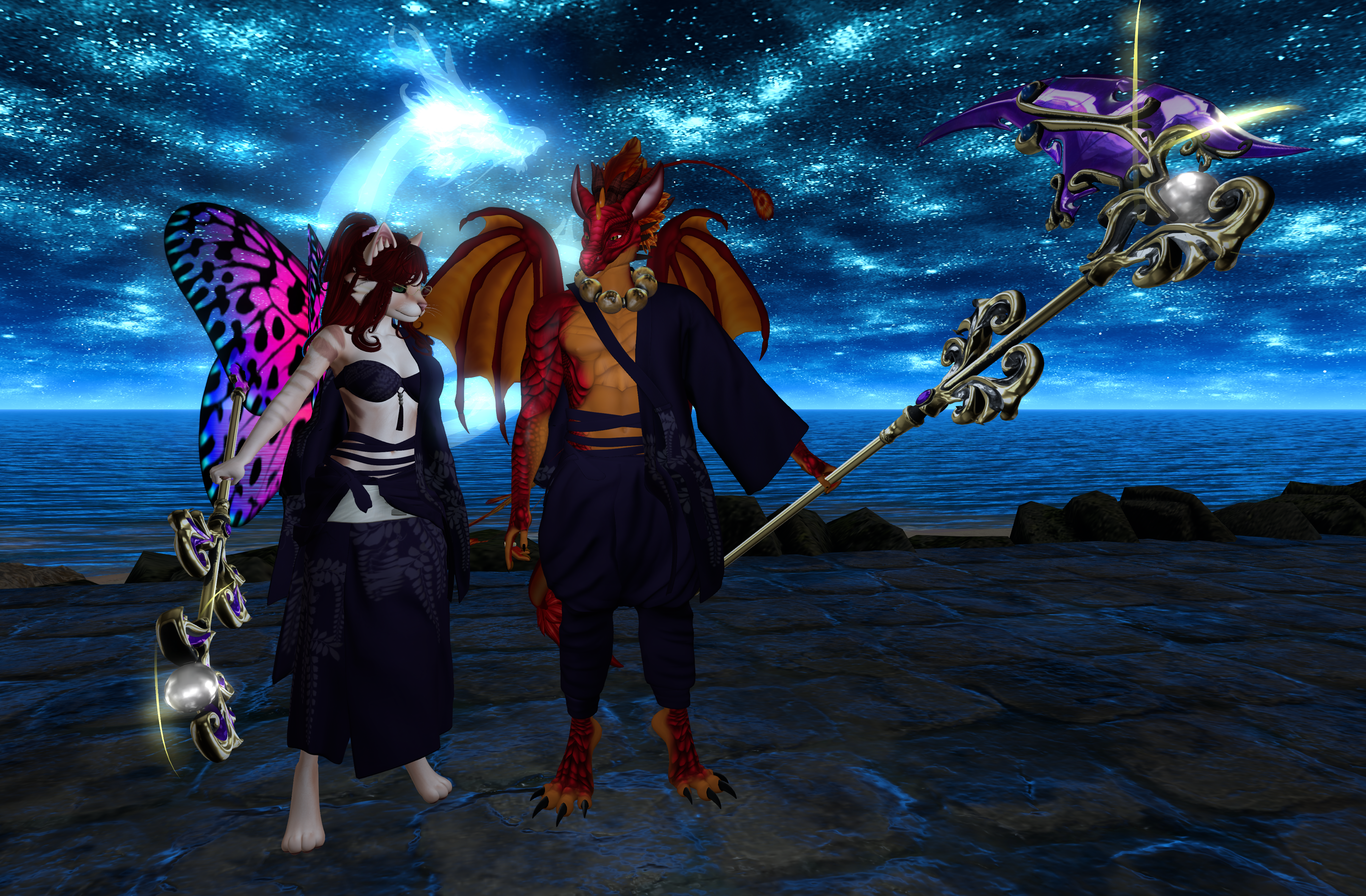 Both of us are holding a weapon by Schelm from their Seiryu sets. He's holding the scythe and staff, each one is color change and you can turn the swirling lights on and off. The poses are from Stoneviel, but didn't work with any of the outfits so I used them here. They are by Uzme and a part of their duel blade sets.