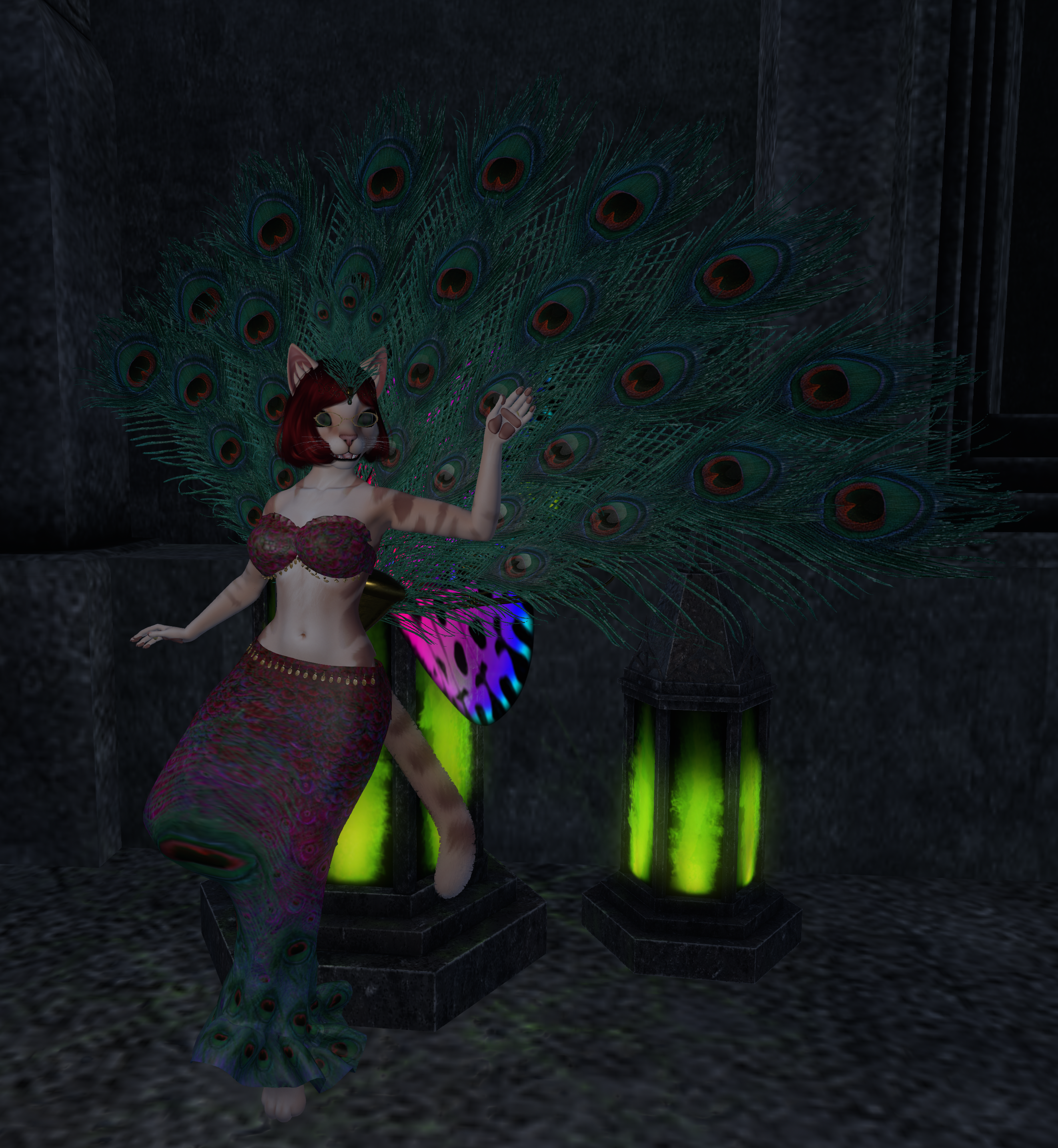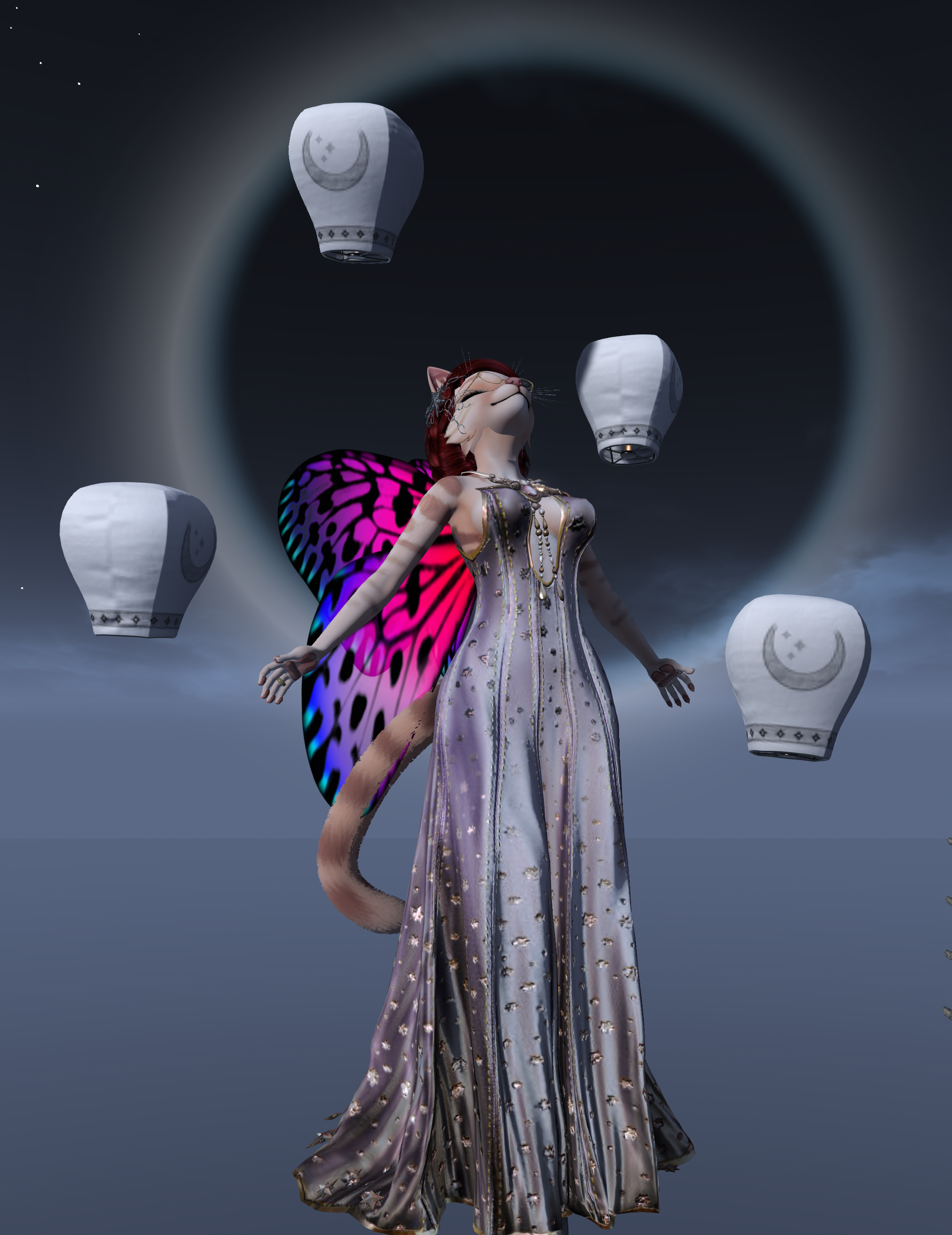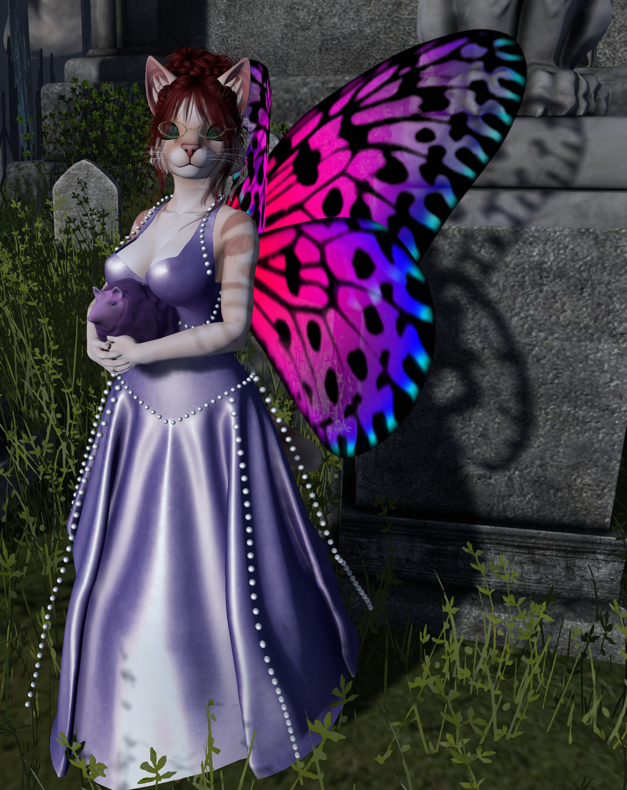 I have one wearable to show off because I can NOT skip out on showing off Fancy Faeries wings! And shes the only wings I'd be showing off! The 1st life wings I have by her are based off her Titania shape, which Im wearing here. For the pattern on these wings I'm wearing the Lotus one. Which is one of her relay offerings. The gown is also by her and I blogged it a few months ago. it's called Lily Corset & Skirt