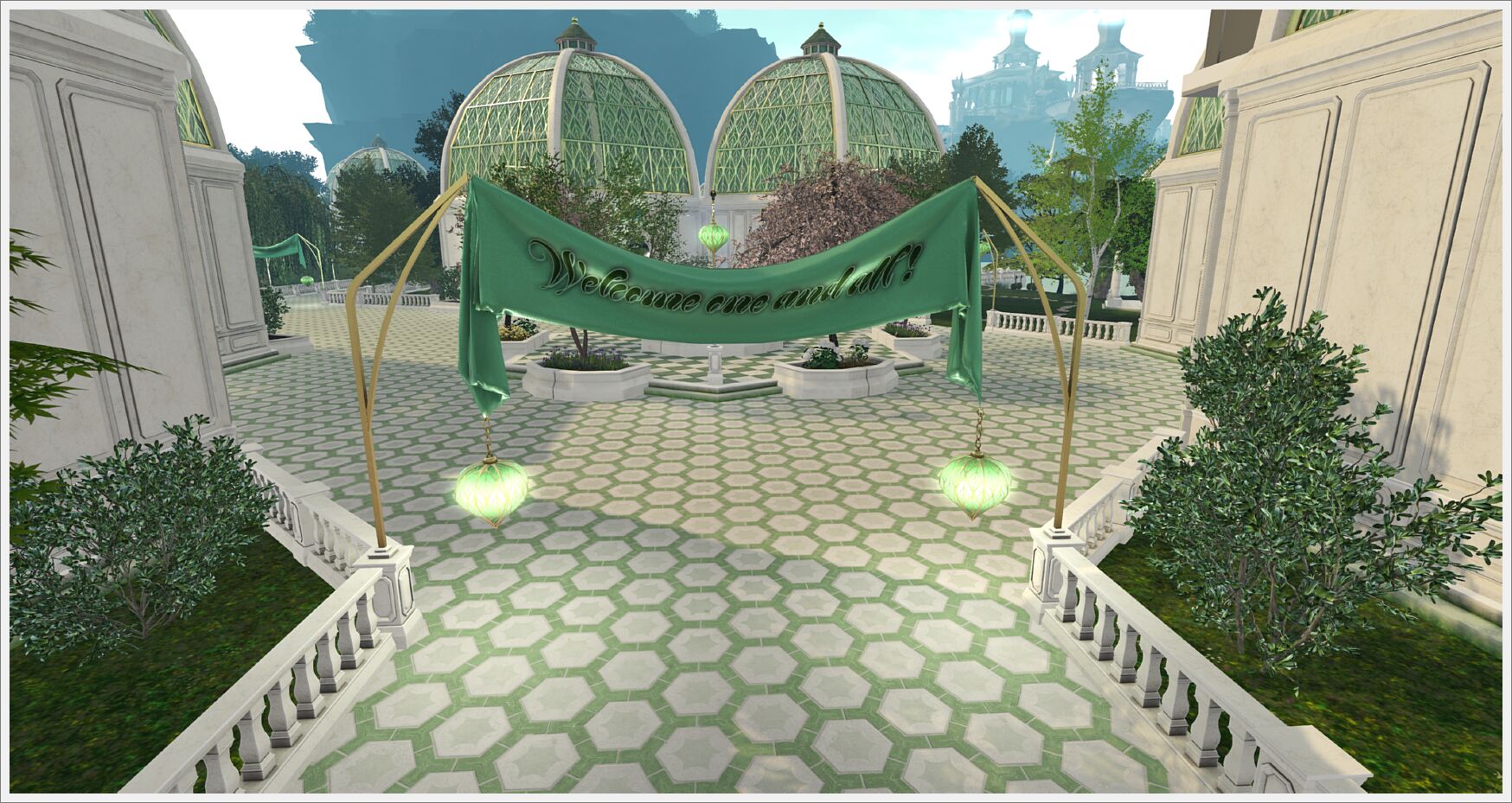 Aventurine Promenade is a glory of soft greens, the shade of its namesake stone, shining marble and glimmering gold trim. You enter the town under welcoming banners and softly glowing lanterns. Making your way up the park like streets you'll reach a grand festival spread, food and drinks of all kinds and many table to enjoy it on.
